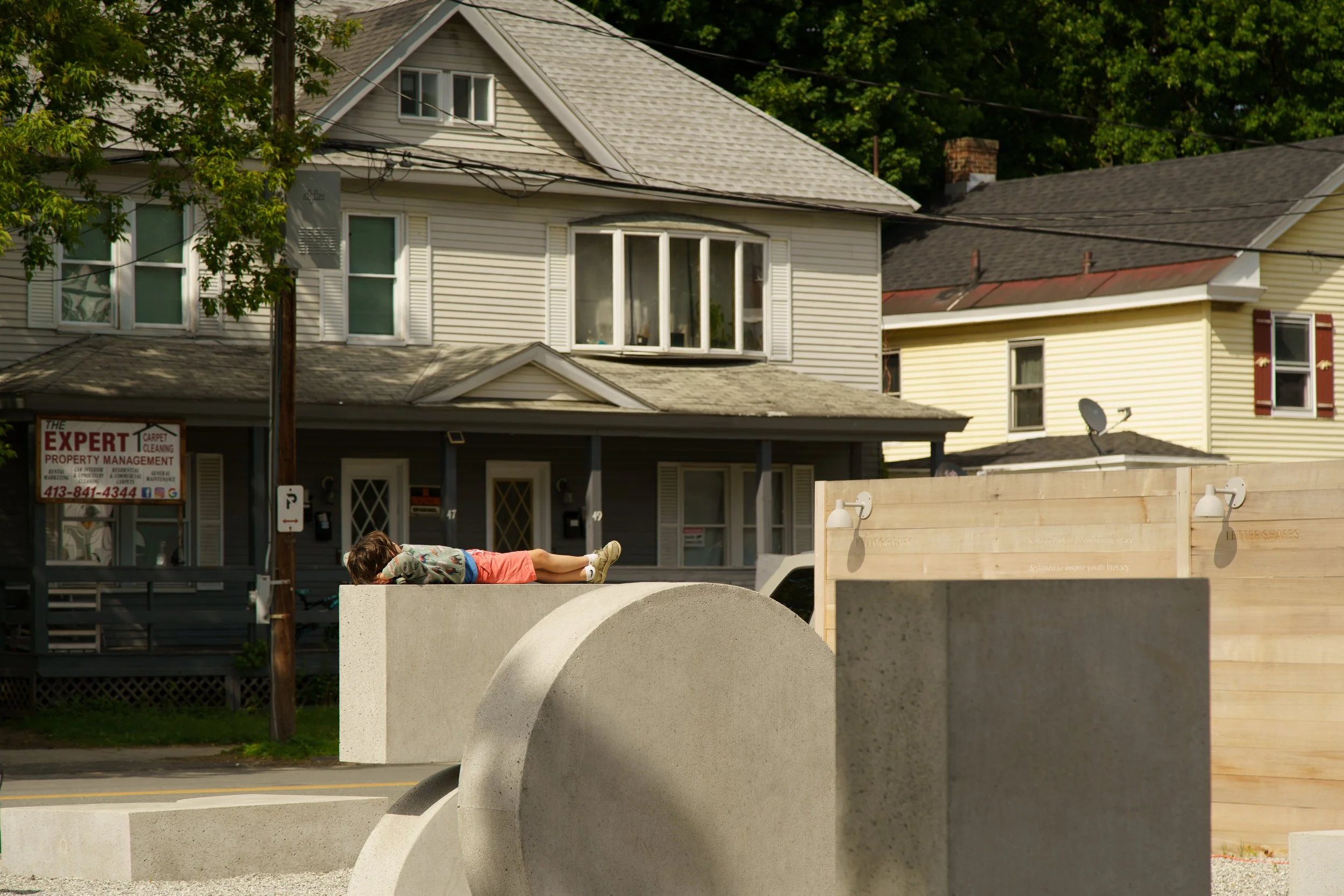 A corner park in Pittsfield’s densely populated Morningside neighborhood, this space was designed in partnership with the local elementary school as an outdoor classroom to inspire literary, spatial, and mathematical learning. The 26 concrete sculptural forms at the park each represent a letter of the alphabet.