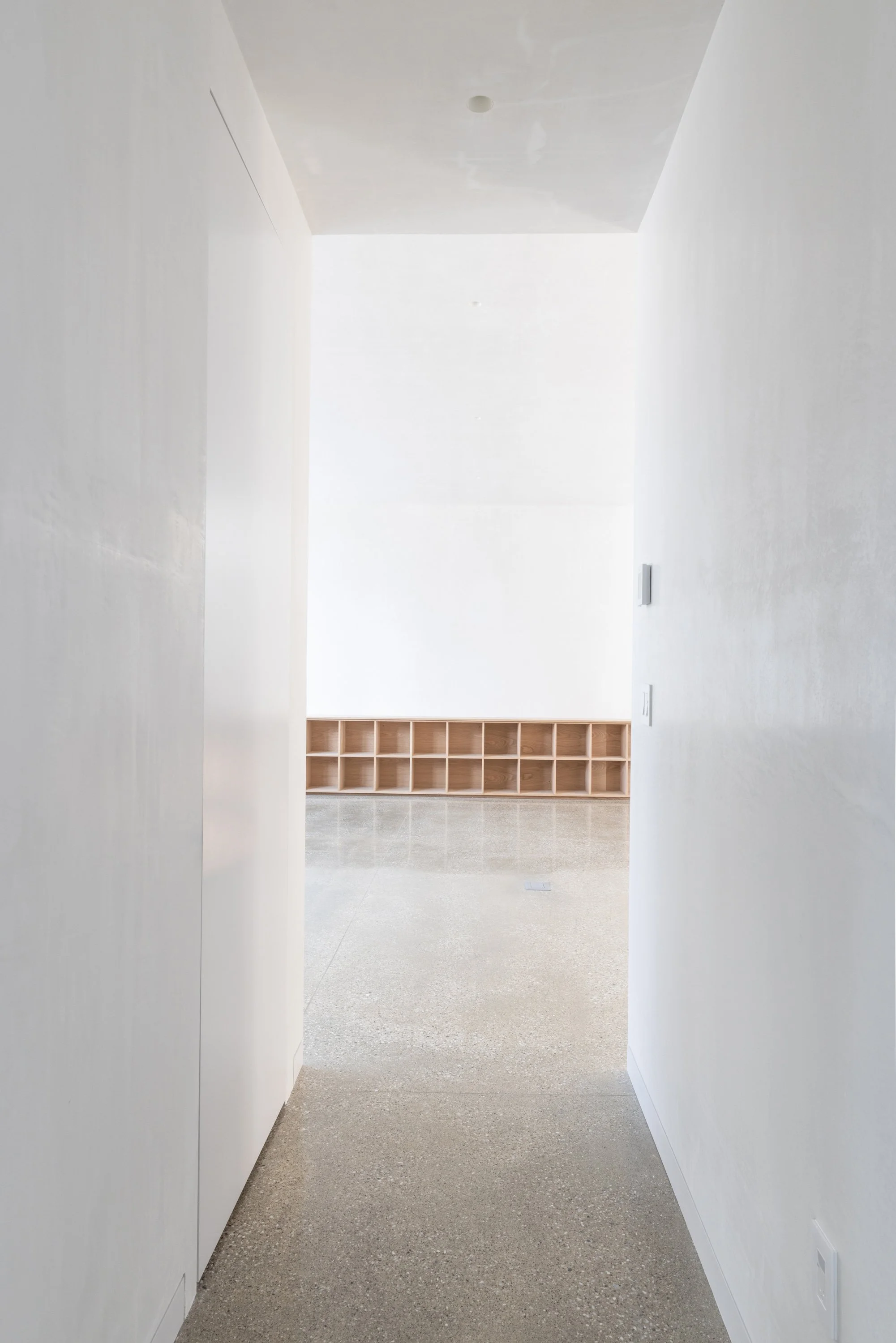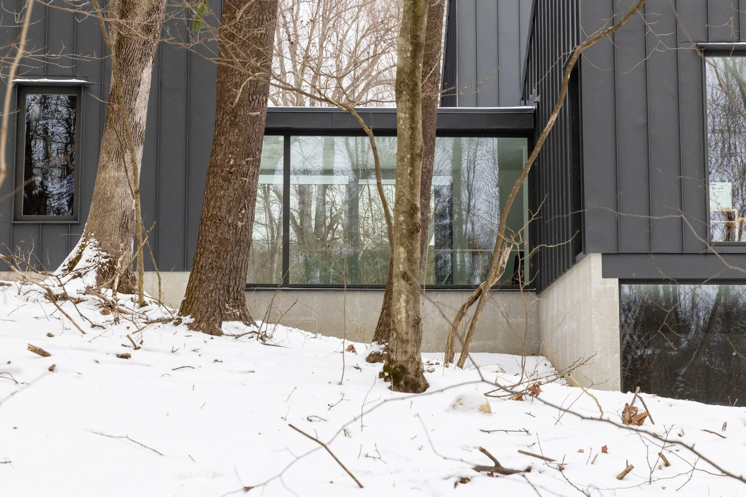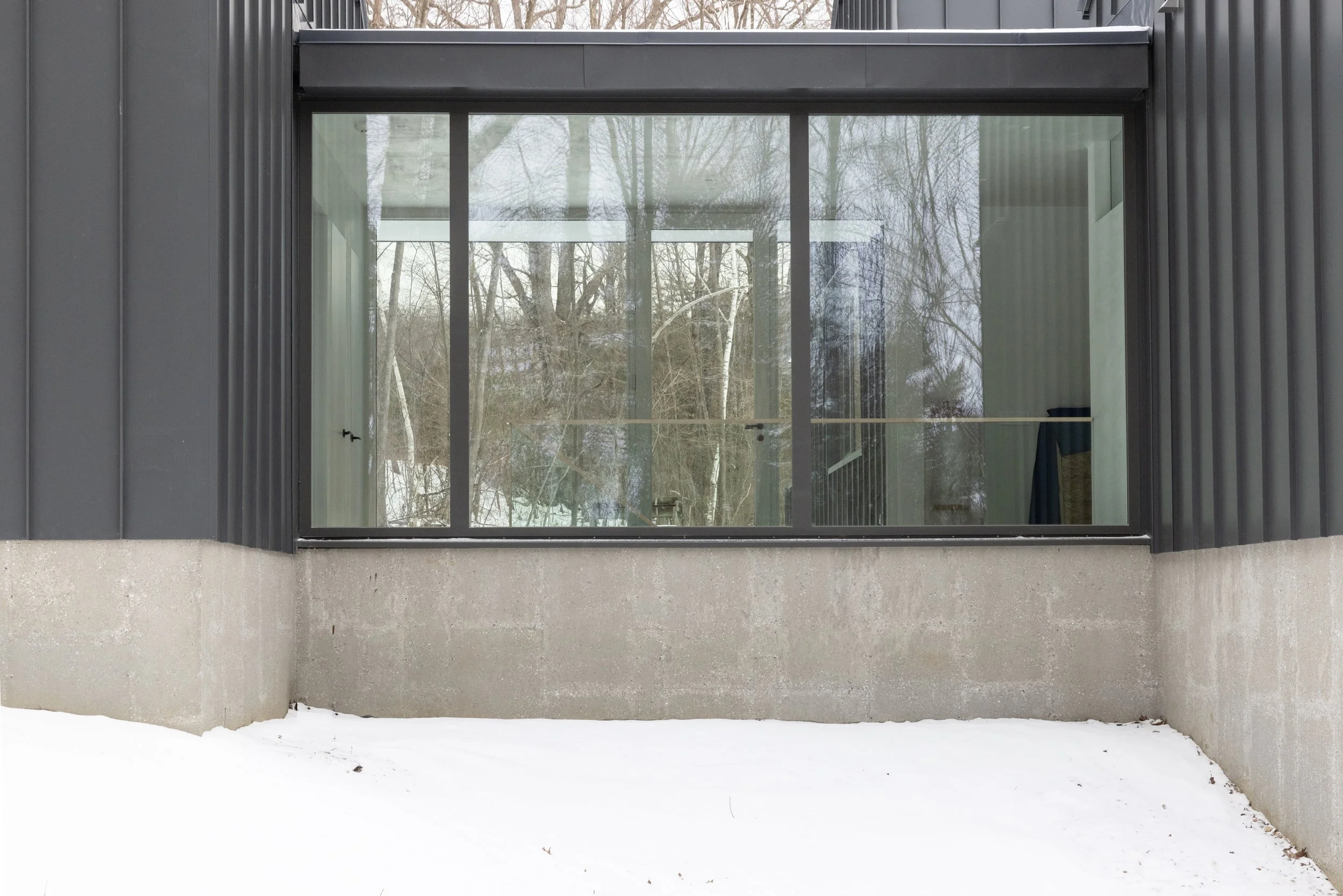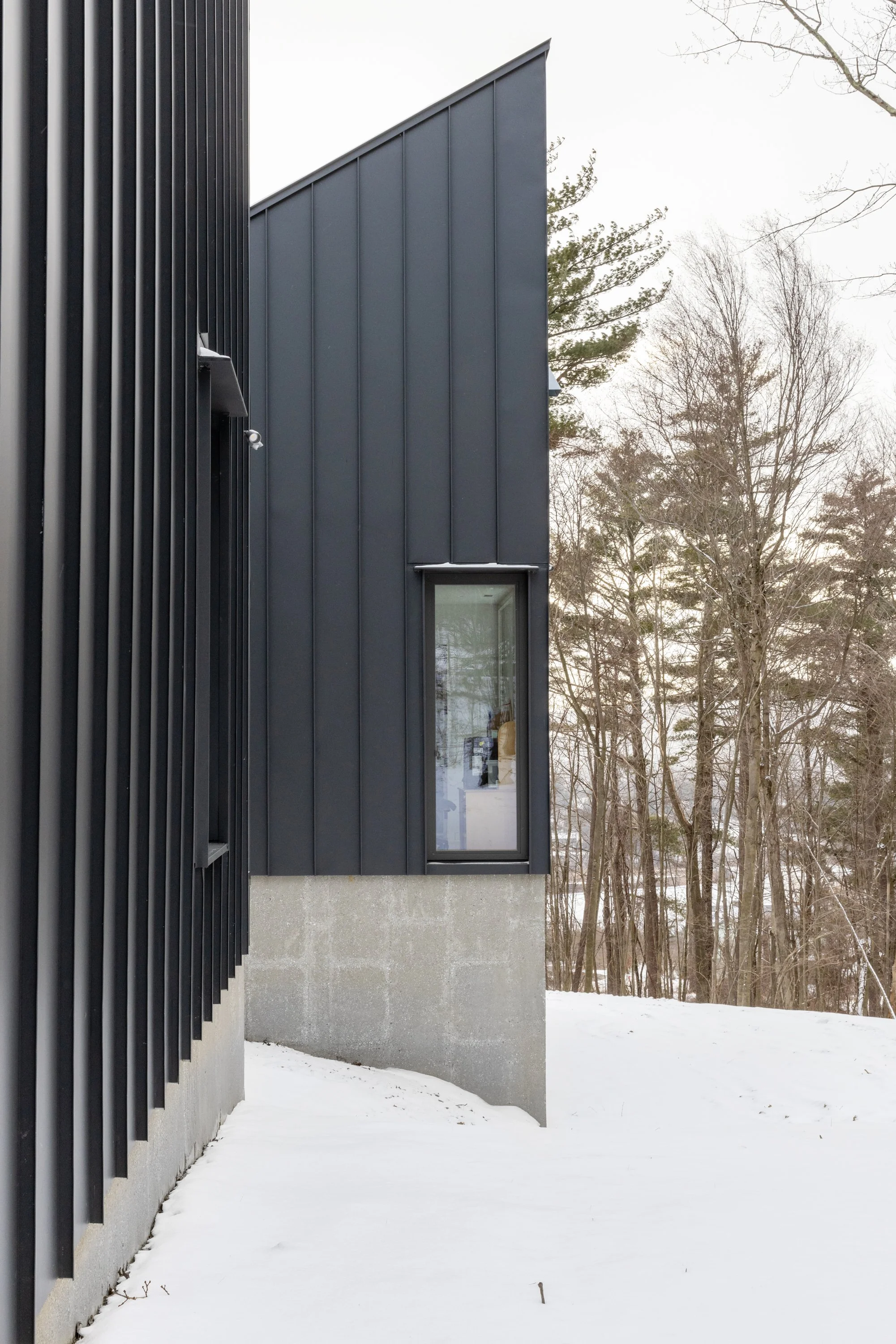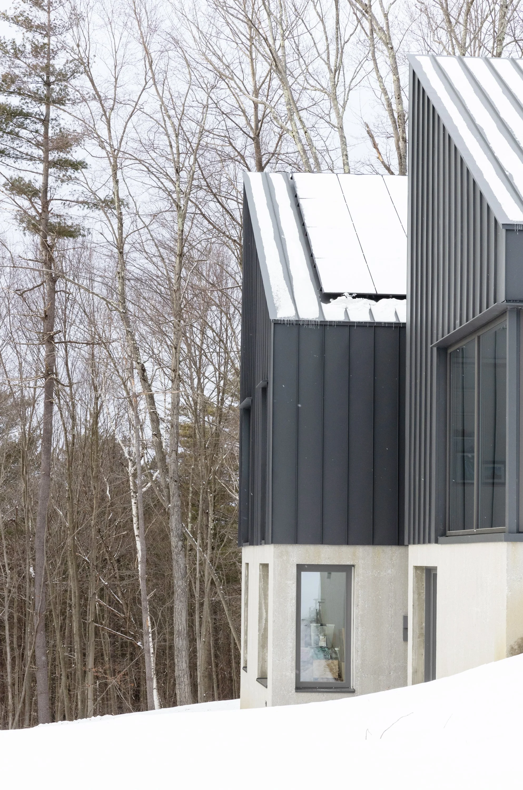 This aging-in-place home tucks into a wooded hill and opens toward the valley to frame views of the village of Williamstown. Three peaked forms slope upward toward the trees and organize the plan into three areas: the garage, the sleeping area, and the living space. In section, this is a double house: one fully functional residential zone on the lower level can accommodate an independent caretaker while the upper level is fully accessible and entered on grade.
