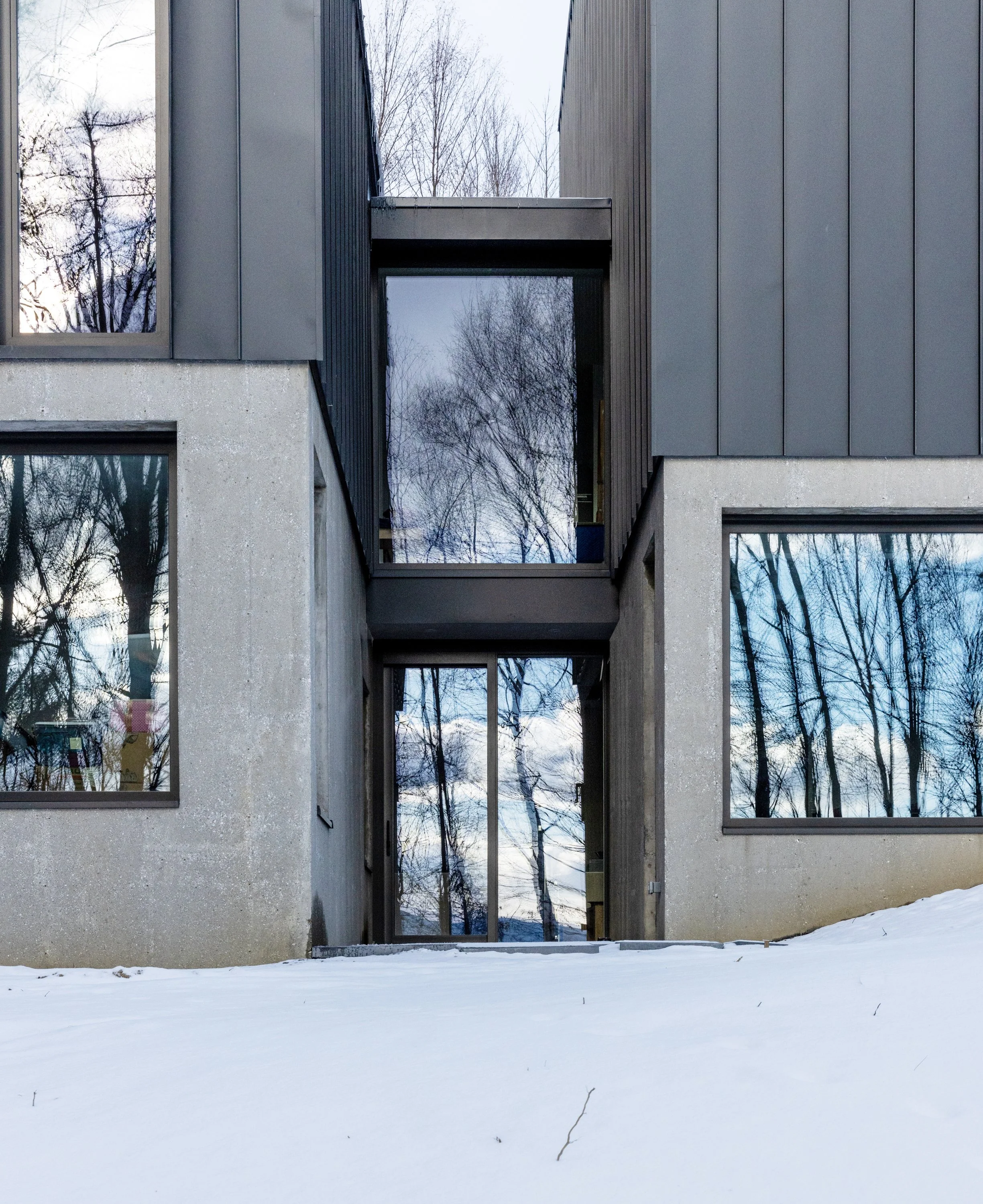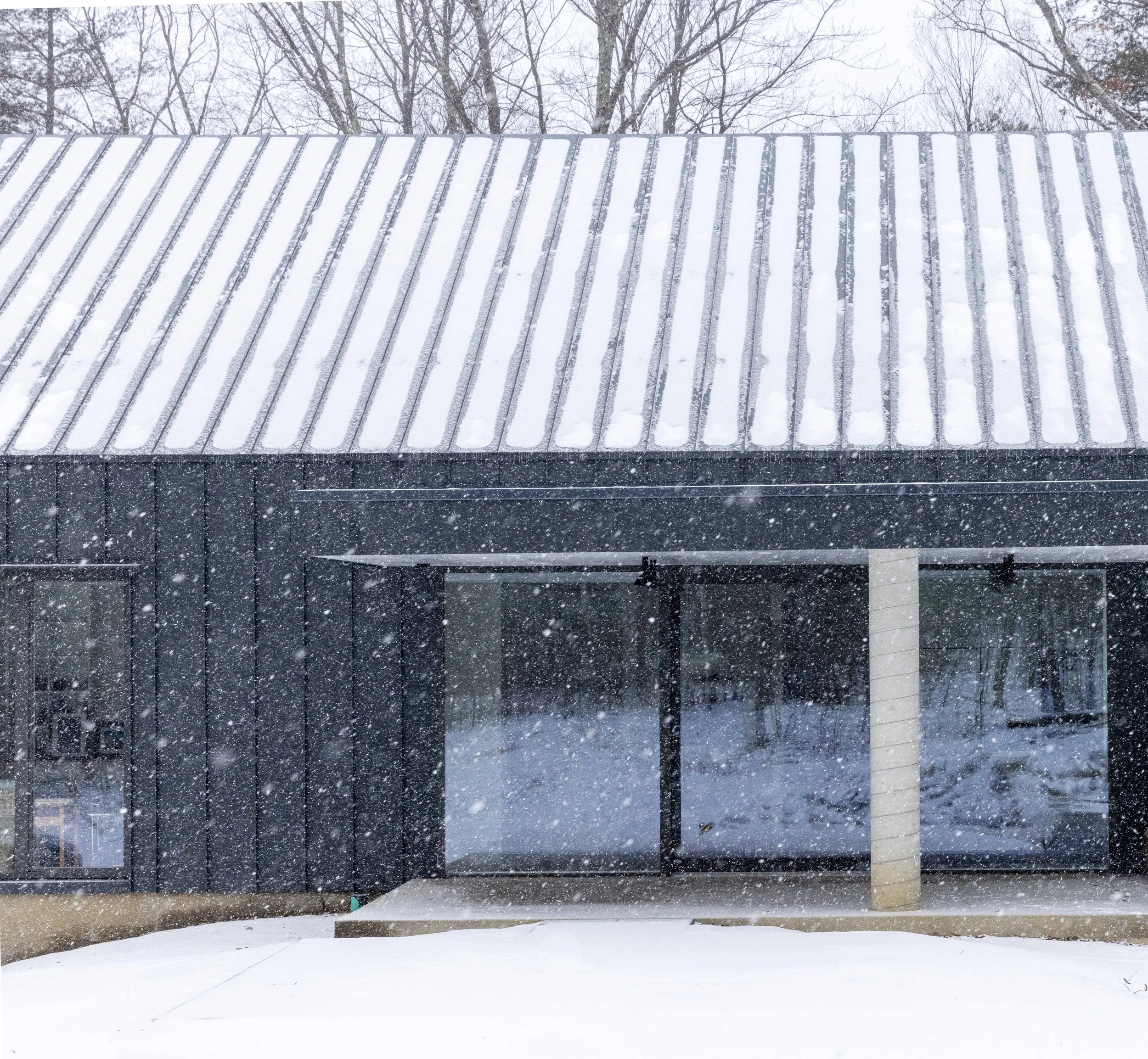The peaked forms are linked by glassy, flat-roofed connectors that allow for visual continuity across the site. The exterior of the lower level is sandblasted concrete, and the walls and roof of the upper level are wrapped in standing seam metal.