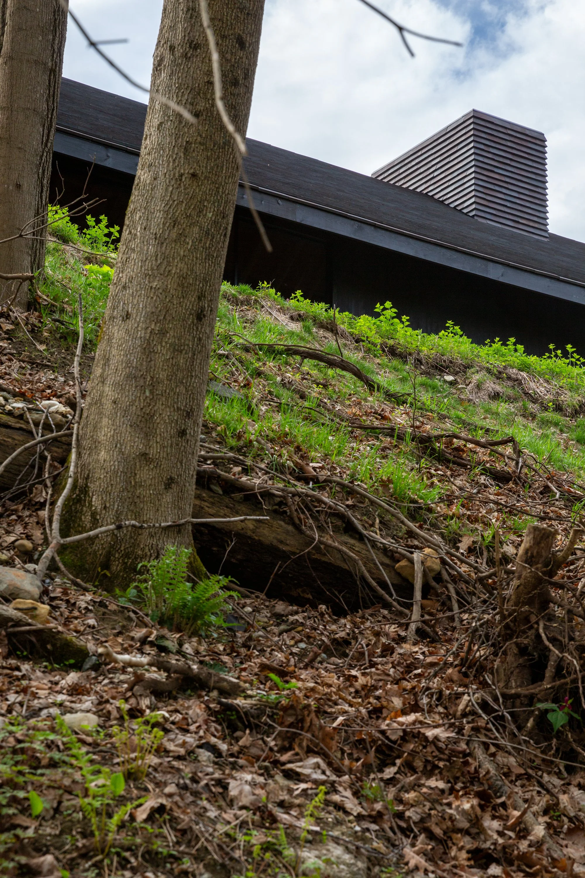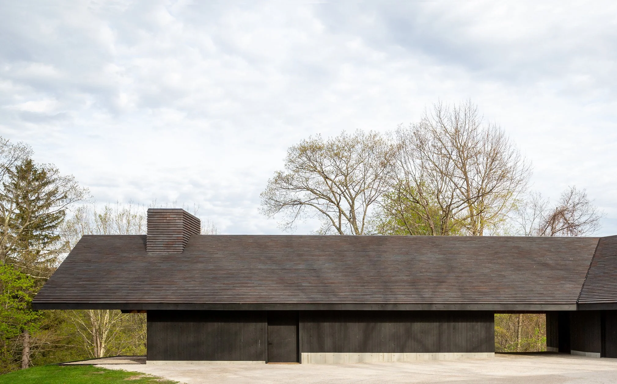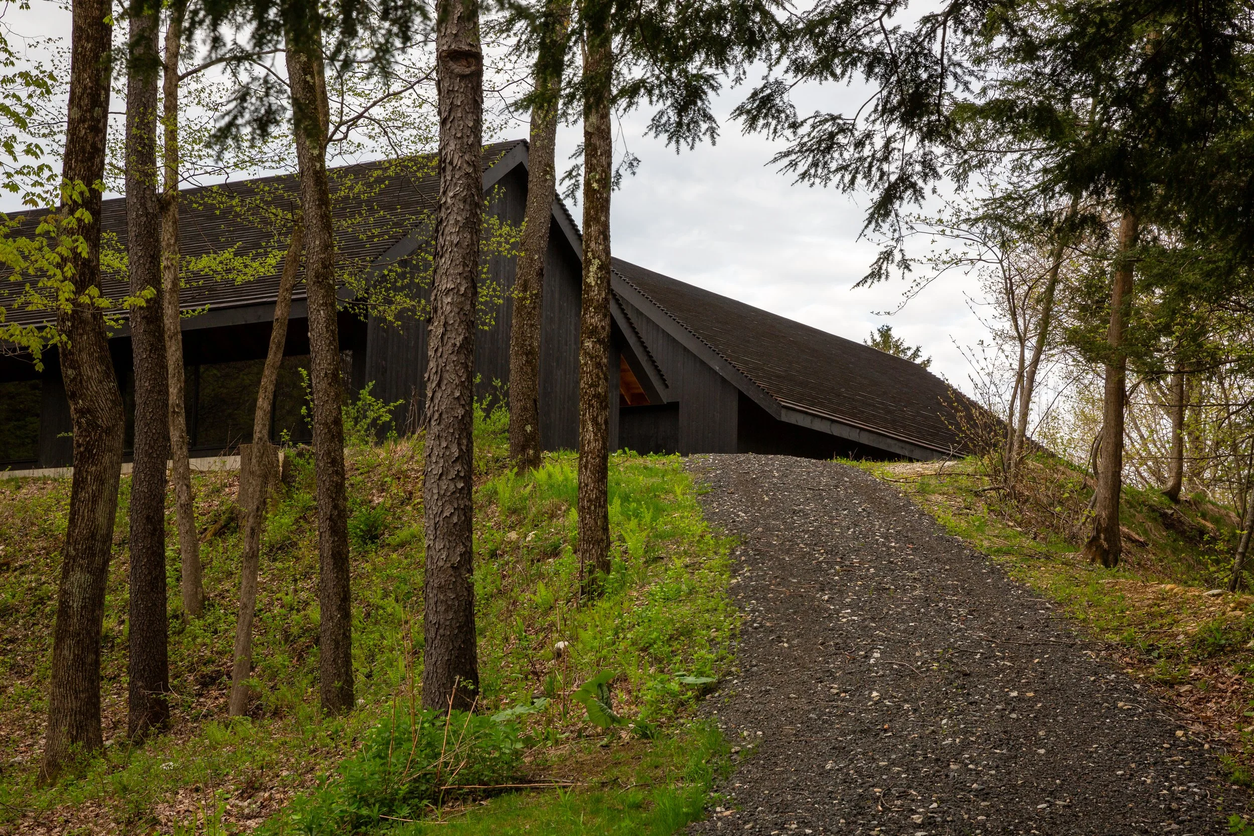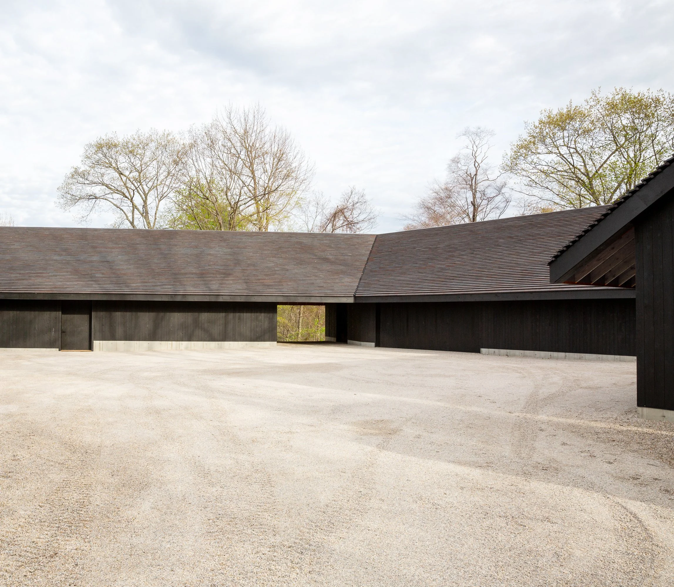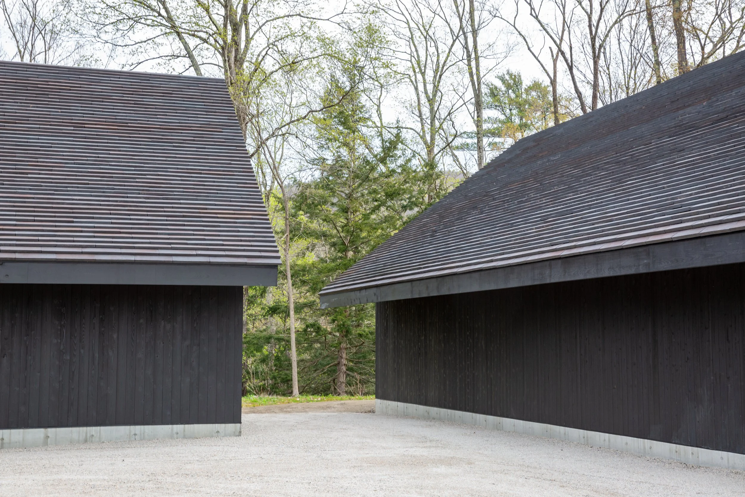 Three sculptural utility buildings serve a 70-acre nature compound in Williamstown, MA. The three structures wrap a central courtyard with generous eaves, breezeways, overhangs, and oversized doors that allow for a continuous flow from the inner courtyard through the interior spaces and out into the forests beyond. Clay tiles provide a rich texture that defines the roof as the primary spatial driver of the buildings. The clay tiles dynamically respond to the changing light and shadows throughout the day - at times appearing flat black, and at times revealing a prism of rusty hues.